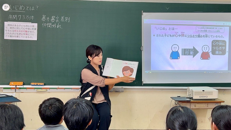 いじめの定義についての導入後、教員が絵本を読みきかせ児童にいじめについて考えさせます。