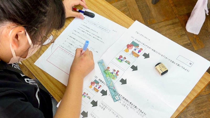 指導者:今日はいじめ予防について学びましたね。最高学年として、学校全体に対してどんなことができるでしょう。